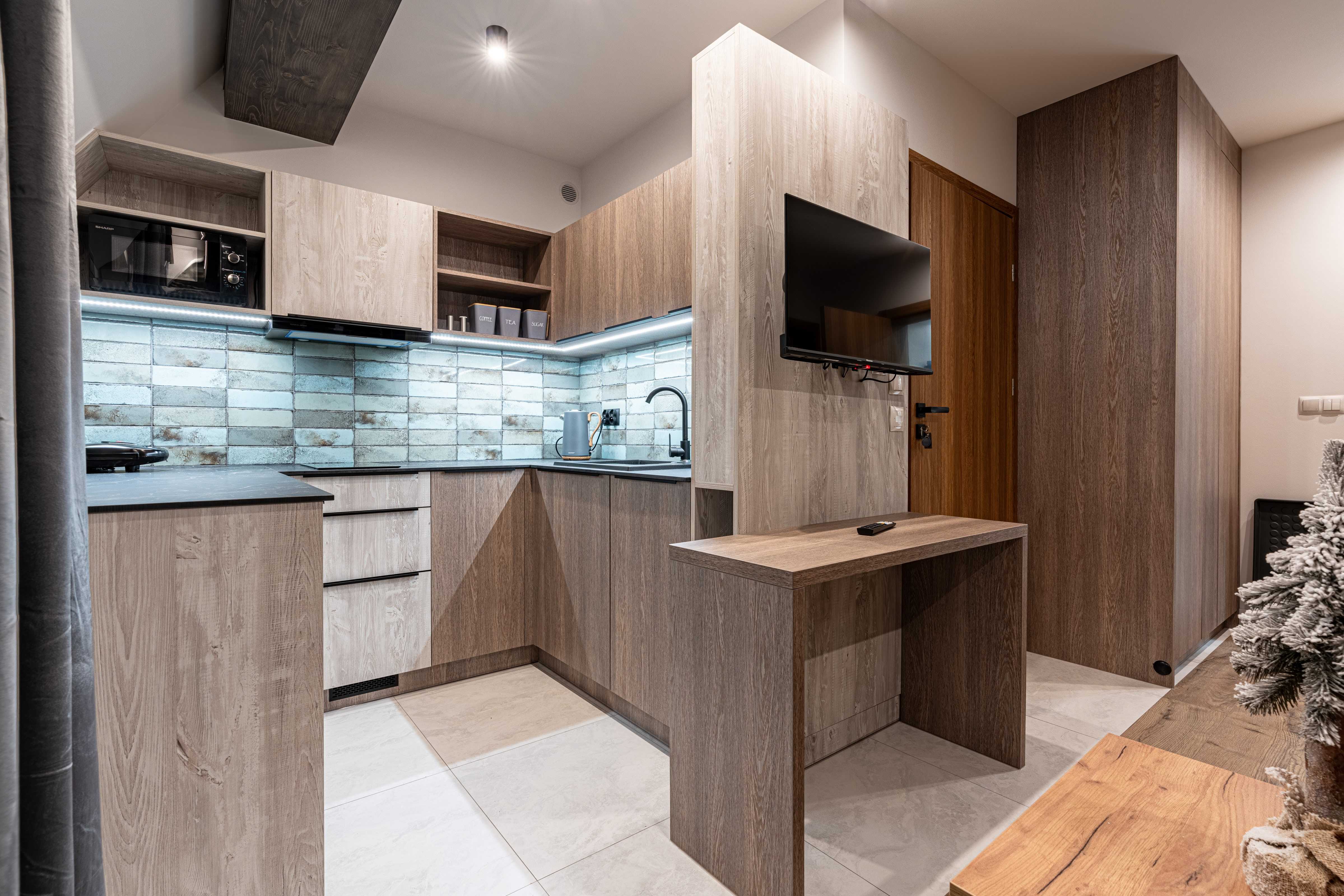 Każdy z apartamentów posiada salon z aneksem kuchennym wyposażonym w: