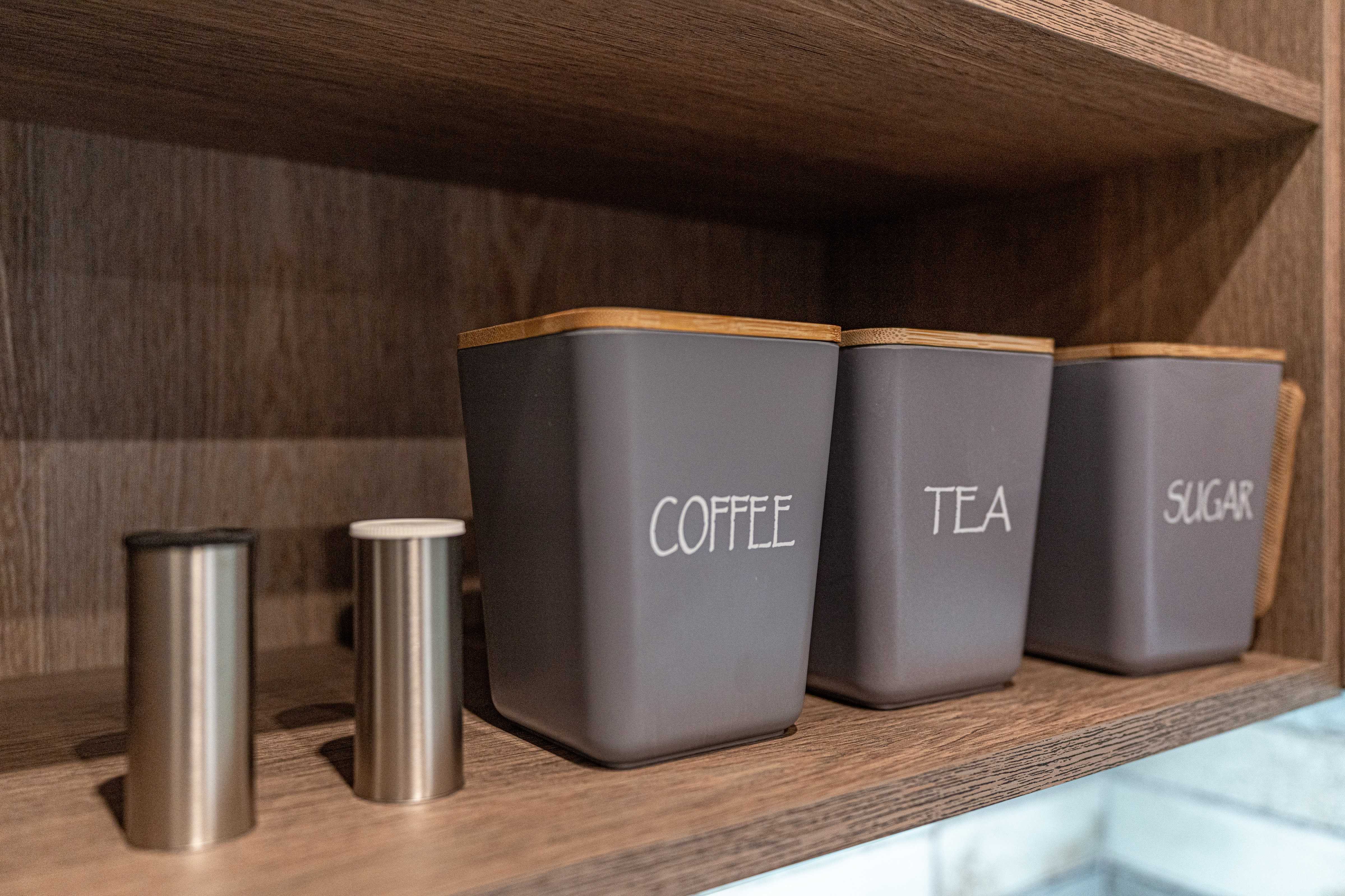 lodówkę, płytę ceramiczną, czajnik, expres do kawy, kuchenkę mikrofalową, zmywarkę, naczynia, sztućce, garnki, oraz sprzęt kuchenny.